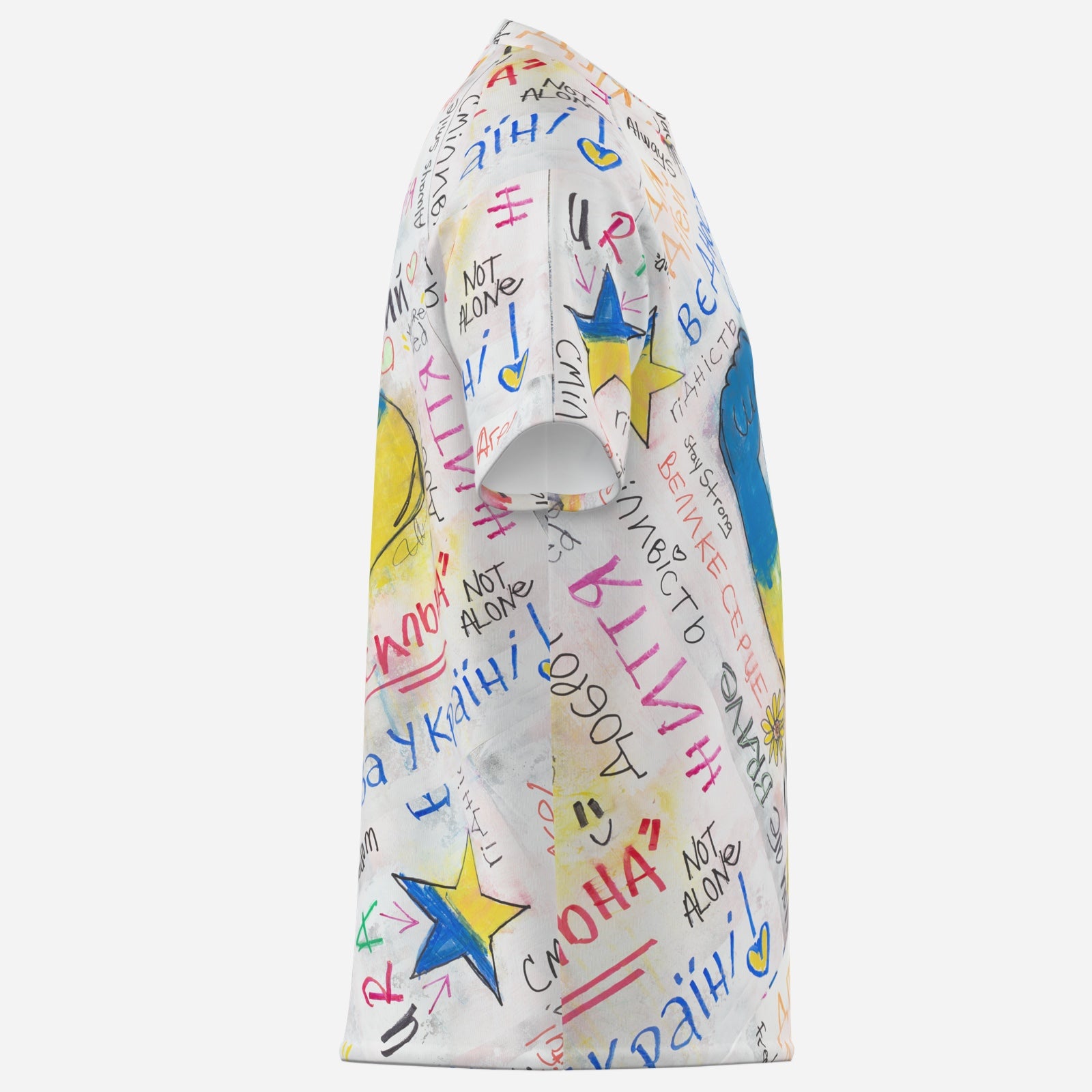 Wear Your Support for Ukraine with this bold design from the iocoArt Graffiti-inspired collection. Featuring a strong arm in the colors of the Ukrainian flag, surrounded by colorful, uplifting words and phrases of courage, unity, and empowerment, this shirt embodies resilience and solidarity.